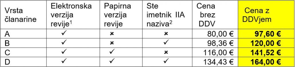 Članarina A z dostopom do elektronske verzije revije IA: 97,60 € (z vračunanim 22-odstotnim davkom na dodano vrednost);